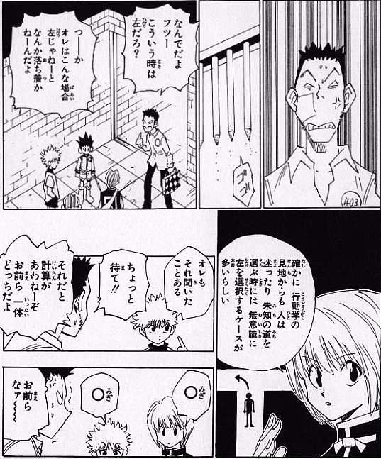 ハンター試験の迷路シーンでは、クラピカが「仕掛け人も人の左を選びやすい心理を利用している可能性が高い」と論理的に推理し、実際に右のルートを選んで正解へと導きます。ただし、これは必ずしも常に正解となるわけではなく、仕掛け人がこうした心理法則を知っている場合に有効な読み筋だとされています。自然物やランダムな状況では、右と左の選択確率は五分五分に近くなります。とはいえ、このエピソードが示すのは「人間の無意識下の行動傾向を読み取ることの重要性」と「多数派心理や常識への疑いを持つ視点」の大切さです。