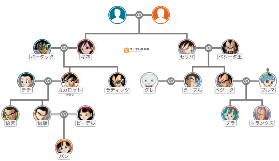 祖父母 | バーダック、ギネ、孫悟飯(養父)、牛魔王 | サイヤ人の起源、地球での育成 |
